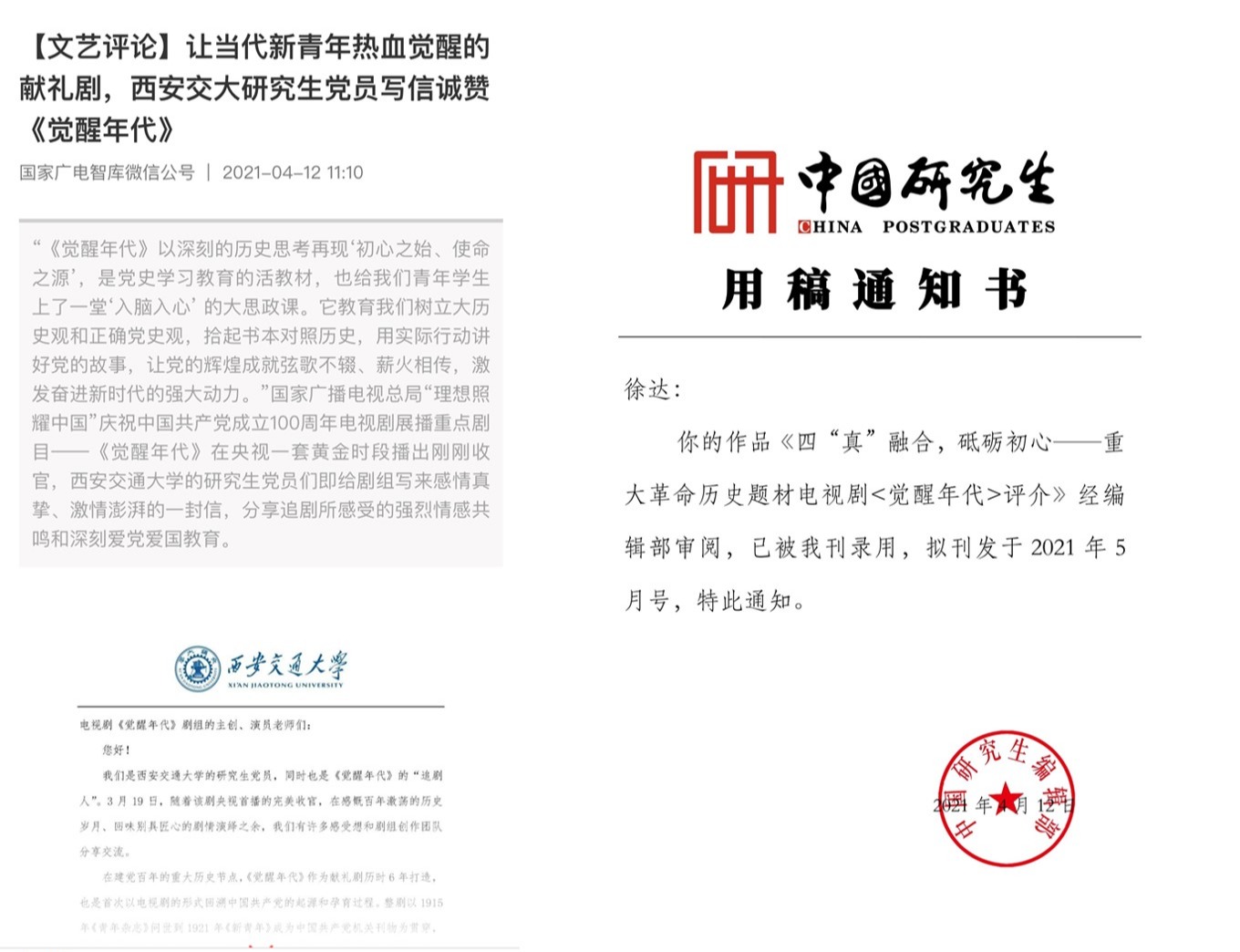 同时,支部积极倡导同学们利用周末空余时间观看红色影片和电视专题片等方式重温党史,进一步强化党的意识和党员意识,树立正确党史观。近期,支部致信《觉醒年代》剧组并收到回信,相关经过被中国青年报客户端、“学习强国”学习平台、“优酷”微博号、“国家广电智库”“三秦学子陕西学联”微信公众号等多家媒体平台报道,登上学校官微,收到强烈社会反响。支部党员文章被《中国研究生》杂志录用,为创新形式开展党史学习教育提供了新思路。