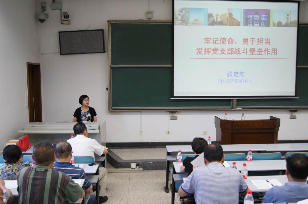 校党委常委张定红以“牢记使命,勇于担当,发挥党支部战斗堡垒作用”为题作专题报告。她指出,习近平总书记关于党的建设的重要论述是新形势下基层党建工作必须遵循的原则。在现代大学的管理体系中,校党委是学校宏观管理的领导核心,学院分党委发挥监督保证作用,党支部是高校党的全部工作和战斗力的基础、是基层组织中的战斗堡垒、是党组织密切联系群众的桥梁纽带。明确党支部的职责,正视党支部工作开展中遇到的困难和问题,严格遵守工作规范,拓展党支部工作思路,才能真正发挥党支部党员联系和服务群众的作用,畅通群众表达意愿渠道。要结合本单位实际,积极主动实践,组织开展好党员集体学习、专题研讨、专题党课、党员评议、专题组织生活等,增强党员的政治意识、大局意识、核心意识、看齐意识,在“两学一做”中做表率。高质量组织好“三会一课”,严格党员日常管理监督,教育服务党员、群众做表率,创新支部活动,真正助力中心工作,为学校建设“双一流”贡献力量。