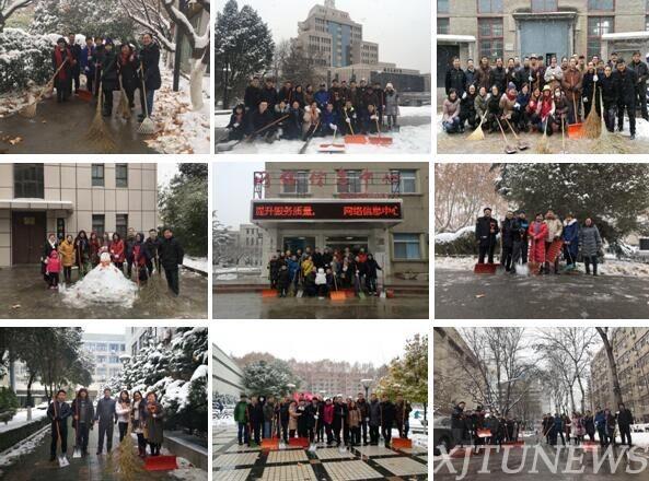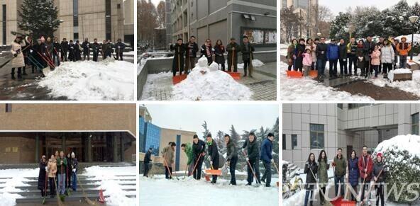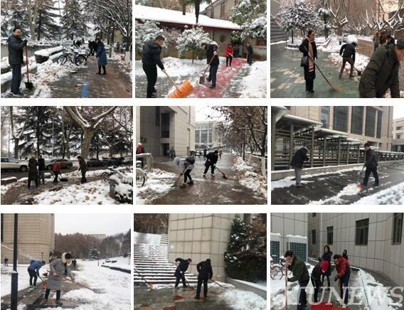 1月7日清晨,各党支部书记、各单位领导干部带头,37个党支部、40余个机关与直属单位的近五百名教职员工不畏严寒赶到学校,有些单位的家属和孩子也一起上阵参加义务劳动,扫除校园积雪,清理人行通道。大家领取工具,细化分工,全力以赴!