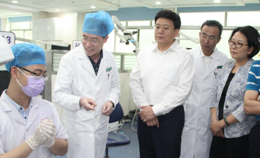 在口腔医院,王贺胜副主任一行听取了口腔医院院长常晓峰、党委书记付勇关于医院发展的介绍,现场调研了国家卫健委改善医疗服务行动计划、医院便民一卡通建设项目,预约诊疗、医保合疗病人异地结算并观看了门诊一卡通使用、实名制挂号等设备使用的现场演示。在三楼牙体牙髓科,考察组一行仔细查看了医院就医环境、诊间支付、感控管理流程及学科建设方面的情况。