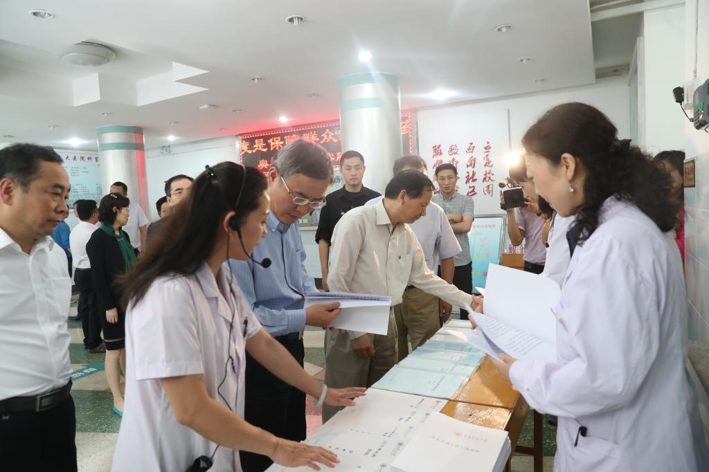随后,蔡达峰副委员长一行来到校医院。在校医院门诊大厅,检查组仔细查阅了学校传染病防控方面的规章制度、工作资料等,现场听取了张西亚院长对医院基本情况的介绍和郝雁副院长对传染病防控工作的汇报。