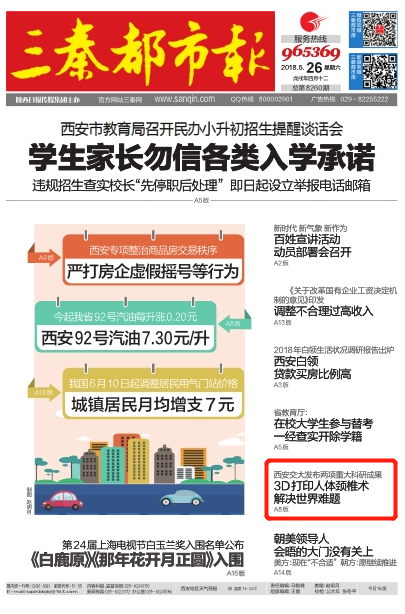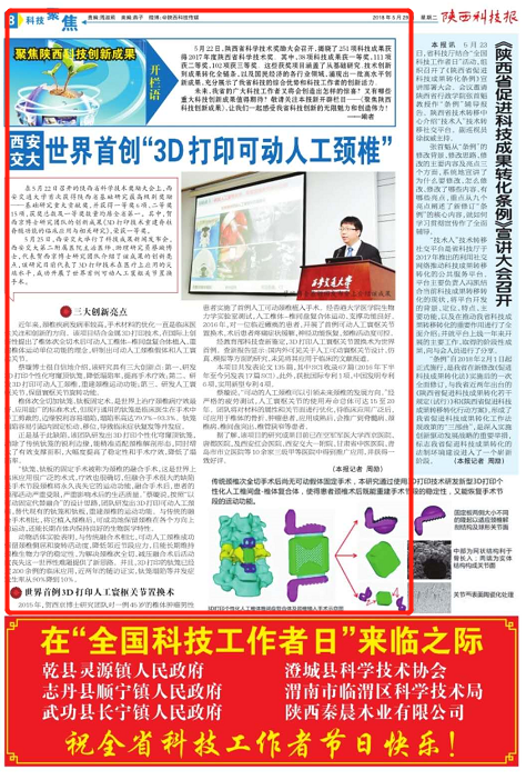 【三秦都市报】头版:西安交大发布两项重大科研成果 3D打印人体颈椎术解决世界难题