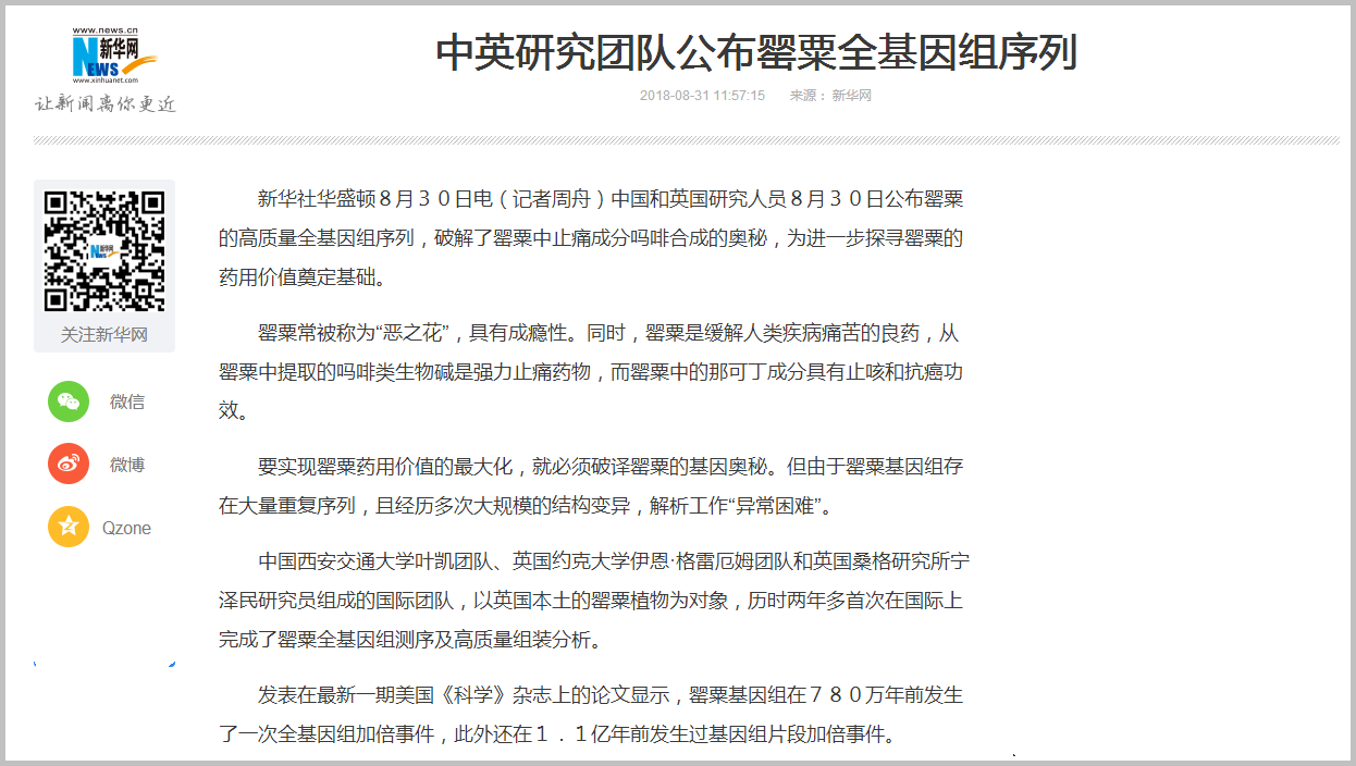 中国西安交通大学叶凯团队、英国约克大学伊恩·格雷厄姆团队和英国桑格研究所宁泽民研究员组成的国际团队,以英国本土的罂粟植物为对象,历时两年多首次在国际上完成了罂粟全基因组测序及高质量组装分析。