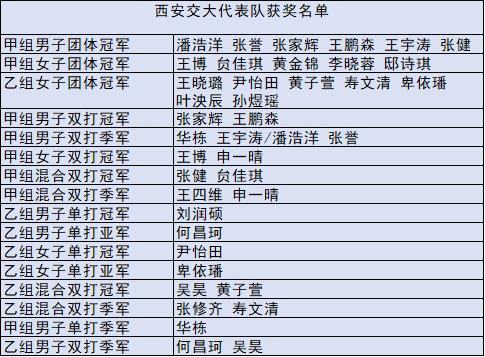 西安交大代表队此次主场作战,队员们状态火热,一个个精彩扣杀和绝妙回挡不断点燃场边观众的热情,现场气氛一再升温。团体赛中,凭借绝佳的技战术水平和过硬的心理素质,一举夺得报名参赛的四项团体比赛中的甲组男子团体、甲组女子团体和乙组女子团体三项冠军,乙组男子团体冠军则由西北工业大学获得。此外,陕西铁路工程职业技术学院包揽了丙组男、女两项团体冠军。