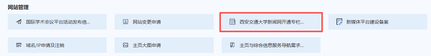 1. 在“服务大厅”菜单下选择“网络信息—网站管理—西安交通大学新闻网开通专栏备案”项目,开始办理。