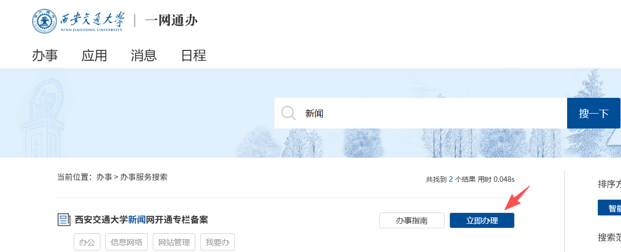 或选择“办事”,在搜索栏中搜索“西安交通大学新闻网开通专栏备案”,点击“立即办理”,开始填写表单。