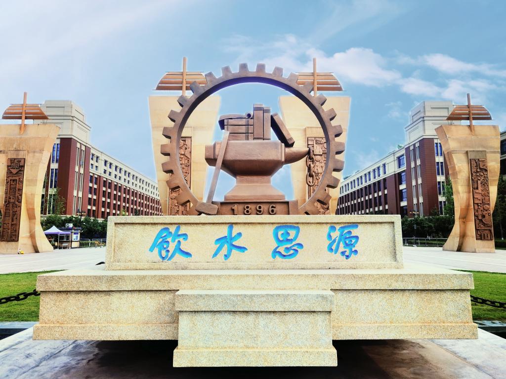 饮水思源碑上部由铁砧、锻锤、齿轮和若干中西书籍组合而成。铁砧、铁锤和砧上放置的中西书籍,体现工文并重、学贯中西之办学特色;砧座阿拉伯数字“1896”,表示本校创办的年份,采用世界公历。整体寓意了“工程”“理论”与“实践”,“严格要求”(锤炼),启示交大学子要理论与实践结合,用理论指导实践,用实践检验和丰富理论的深广含义,而这些都屹立于牢固的基座之上。雕塑基座正面镌刻着遒劲有力的“饮水思源”四个大字,由人民书法家舒同书写,预示了交大及广大学子始终笃定“胸怀国之大者”之初心。