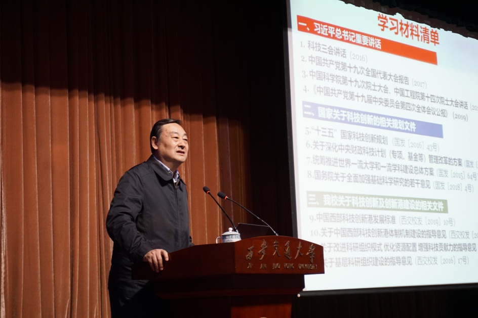 11月13日下午,学校举行“不忘初心、牢记使命”专题党课暨系所负责人培训班第三场报告,王铁军副校长结合前期调查研究,作题为“用‘三个面向’统领学校科研工作与创新港建设”的专题党课。他结合对前几次工业革命的分析,提出面向新时代要进行“有组织的科学研究”,认真研究大科学时代科研项目的属性、内在要求和外在特征,牢牢把握国家层面和教育部层面的政策和方向,对标国家科技计划体系,制定我校层面的“顶天立地”科研目标,用“三个面向”统领学校科技工作和创新港建设。
