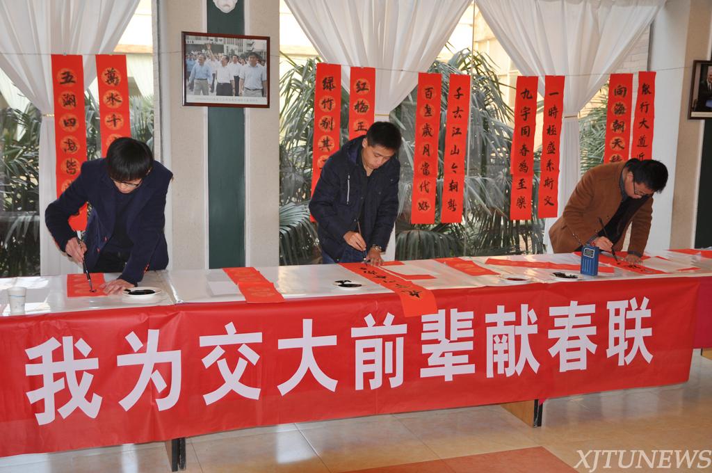 人文学院书法系四名师生现场挥墨,一笔一划写出对交大前辈的真挚祝福,一字一句描出对学校未来的美好祝愿。除了传统春联,他们还特意准备了4幅体现交大昂扬向上氛围和双甲子校庆主题的春联,这些满载情谊的春联将陪伴院士、老领导迎接新年之喜。此外,周伟忠老师带来花篆“福寿康泰乐”、抱团书“家和万事兴”等6幅书法作品,赠予院士、老领导,又添一份吉祥祝愿。
