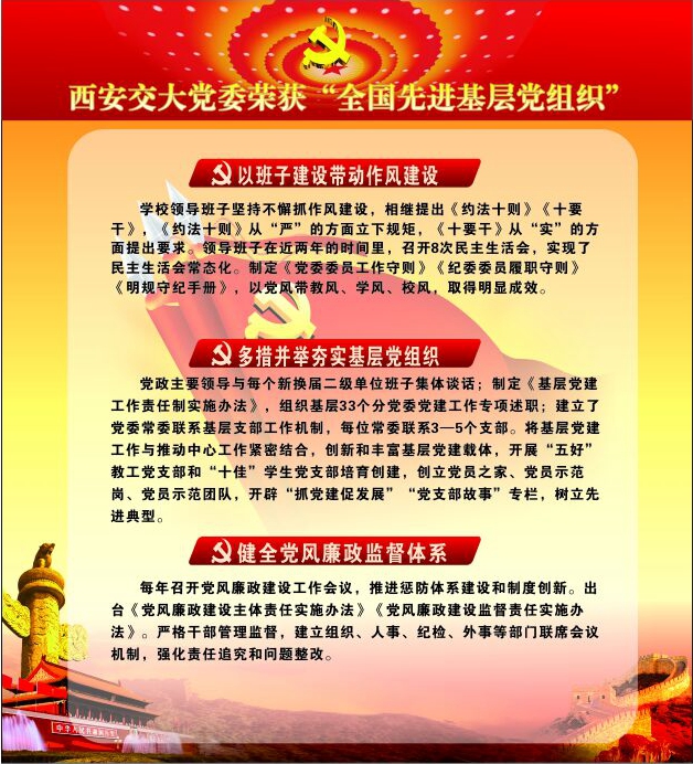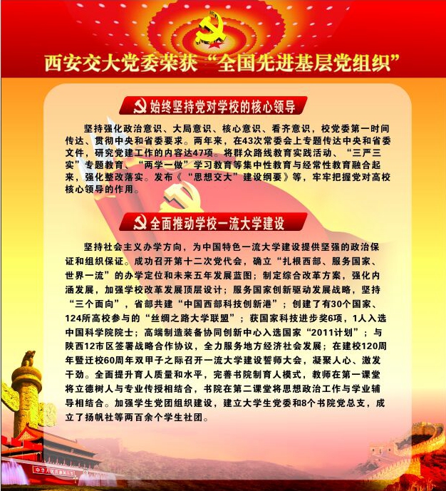 西安交通大学党委始终坚持党的教育方针,坚持社会主义办学方向,坚决贯彻执行党委领导下的校长负责制,不断强化自身建设。通过加强思想引领,牢牢把握党对高校的领导权;加强顶层设计,推动改革发展再上新台阶;加强领导班子和干部队伍建设,切实抓好关键少数;加强分类指导,夯实基层党组织建设基础;加强监督问责,健全党风廉政制度体系,为一流大学建设提供坚强的政治保证和组织保证,在发挥战斗堡垒和先锋模范作用方面取得丰硕成果。