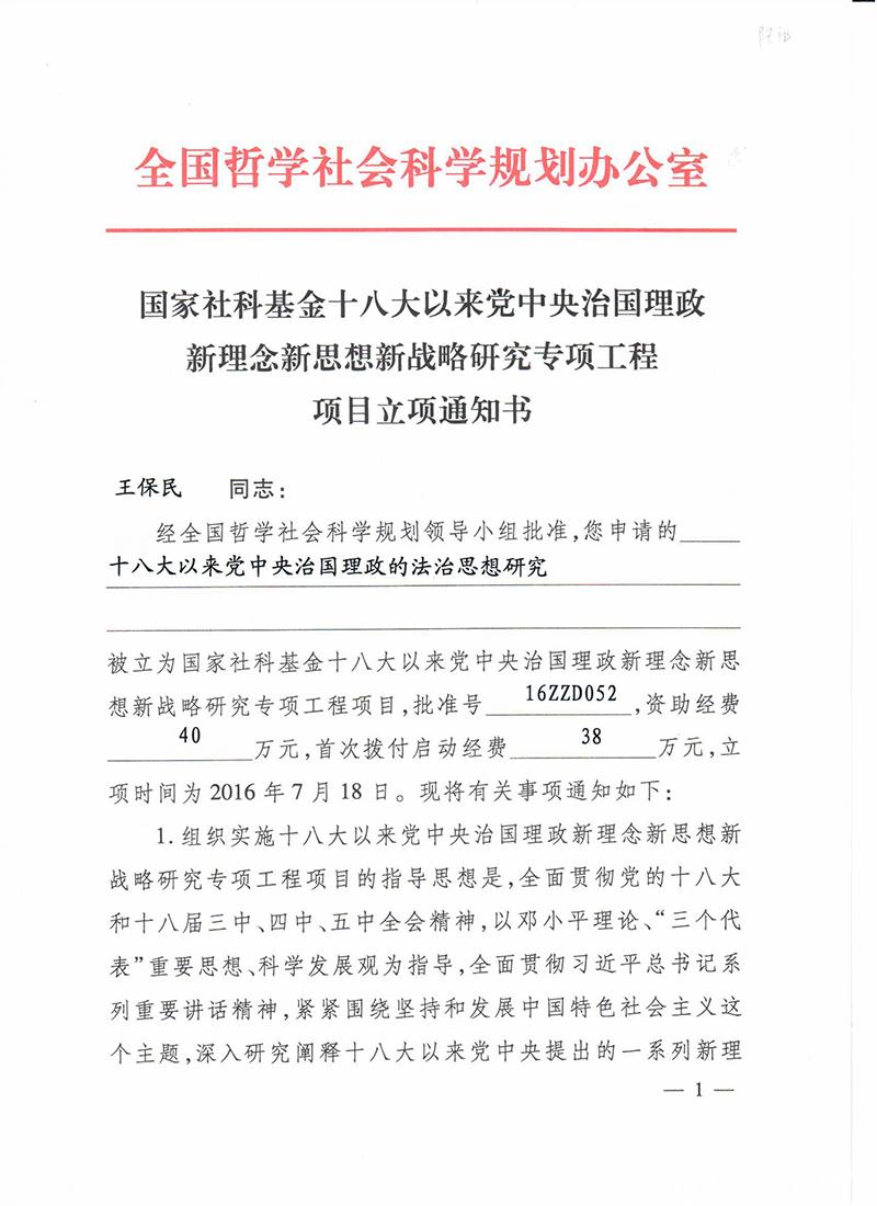 近日,西安交大法学院王保民教授任首席专家主持申报的国家社科基金重大专项项目:《十八大以来党中央治国理政的法治思想研究》,获得批准,批准号:16ZZD052,批准经费40万元。
