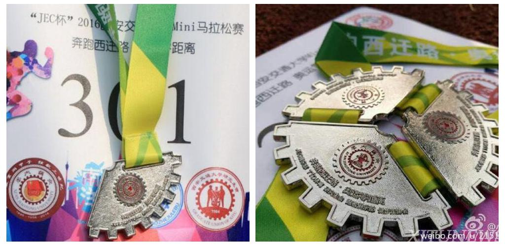 努力就有收获,所有完成比赛的选手都收获了一枚纪念奖牌。奖牌设计独具匠心,奖牌整体为120度圆弧形状,代表了西安交大建校120年光辉历程,奖牌边缘为齿轮状设计,三块奖牌即可拼成完整的西安交大24齿校徽轮廓,十分具有纪念、珍藏价值。