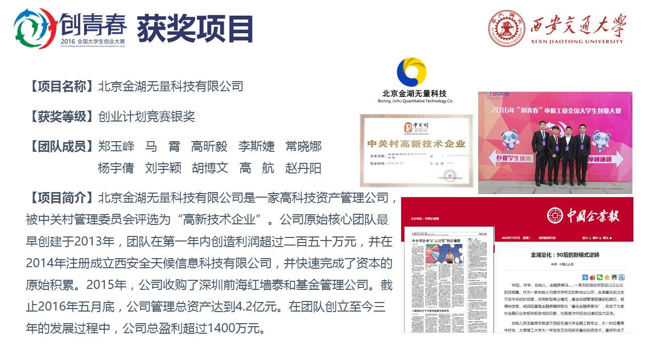 此外,2016“创青春”全国大学生创业大赛还设立了MBA专项赛和移动互联网创业专项赛。在今年8月份的专项赛全国决赛上,西安交大学生创业项目“苏州牛顿眼网络技术有限公司”获得电子商务专项赛金奖,成为全国10个金奖项目之一;学生创业团队“西安苏秦电子科技有限公司”获得MBA专项赛铜奖,通过比赛融资平台获得长虹创新投资公司200万意向风险投资资金,成为专项赛仅有的成功获得风险投资的三个项目之一。管理学院杨建君教授受邀担任专项赛全国评委。